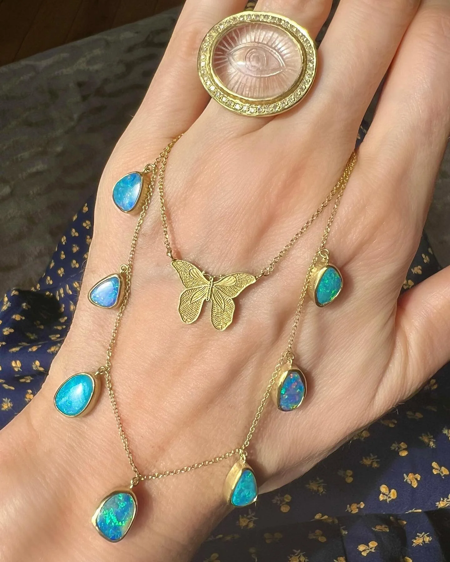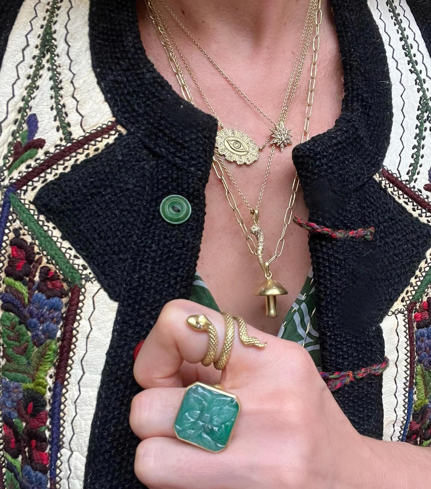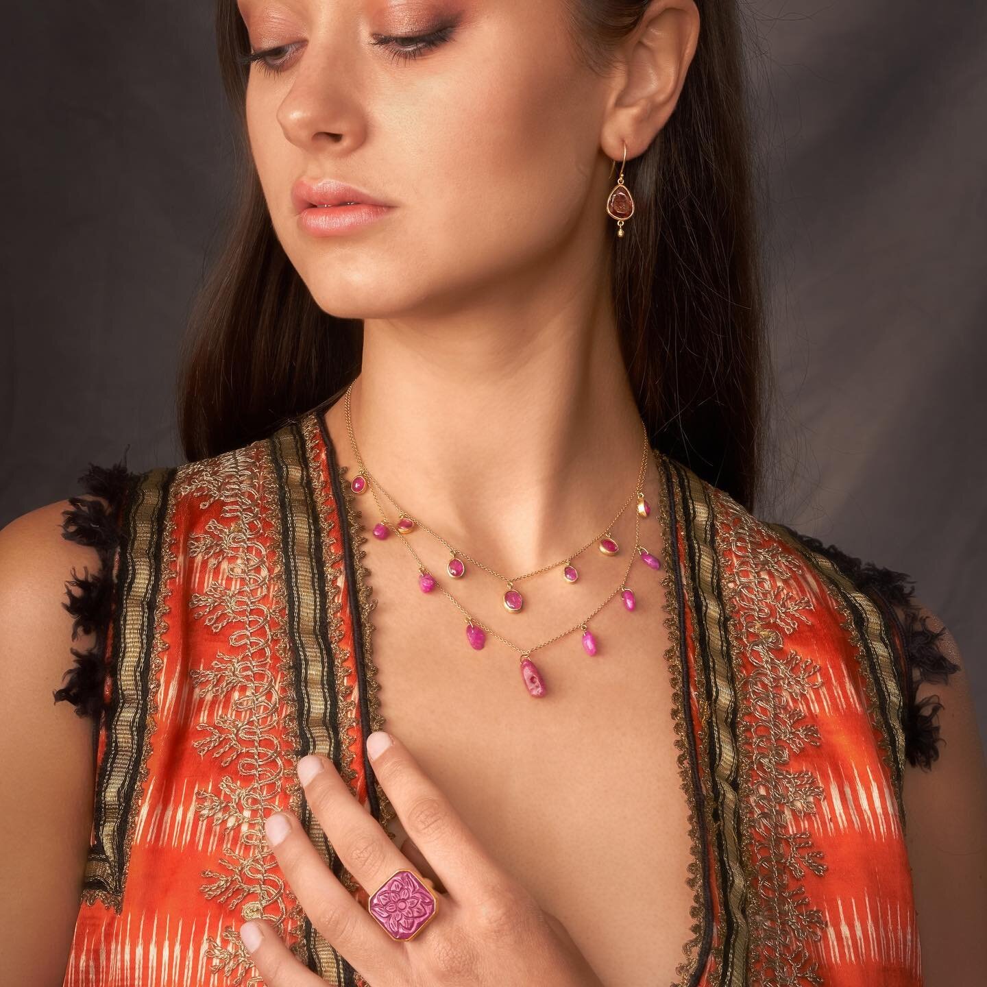 Working with the most accomplished artisans in India and South East Asia, the aesthetic of Sophie’s design is soft and bohemian, delicate yet bold, and with a nod to the antiquities and religious symbolism that she encounters on her frequent travels. She sources only the highest quality precious stones and works with the finest 18ct gold.